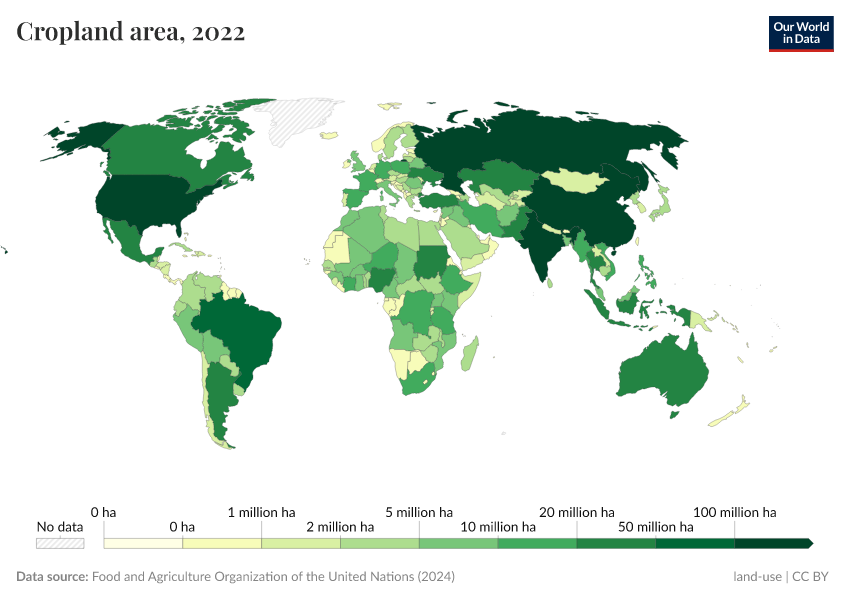 Food and Agriculture Organization of the United Nations (2024) – with major processing by Our World in Data. “Cropland area – FAO” [dataset]. Food and Agriculture Organization of the United Nations, “Land, Inputs and Sustainability: Land Use” [original data]. Retrieved May 8, 2025 from https://enhance-improve-who-empower.owid.pages.dev/grapher/cropland-area