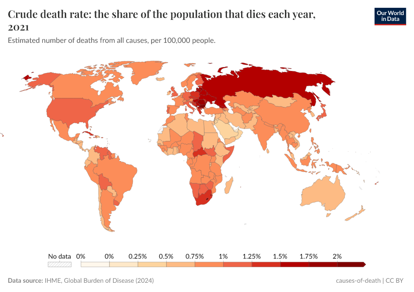 IHME, Global Burden of Disease (2024) – with minor processing by Our World in Data. “Crude death rate: the share of the population that dies each year” [dataset]. IHME, Global Burden of Disease, “Global Burden of Disease - Deaths and DALYs” [original data]. Retrieved May 8, 2025 from https://enhance-improve-who-empower.owid.pages.dev/grapher/crude-death-rate-the-share-of-the-population-that-dies-each-year-gbd
