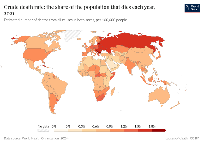 World Health Organization (2024) – with major processing by Our World in Data. “Crude death rate: the share of the population that dies each year” [dataset]. World Health Organization, “Global Health Estimates” [original data]. Retrieved May 8, 2025 from https://enhance-improve-who-empower.owid.pages.dev/grapher/crude-death-rate-the-share-of-the-population-that-dies-each-year-who