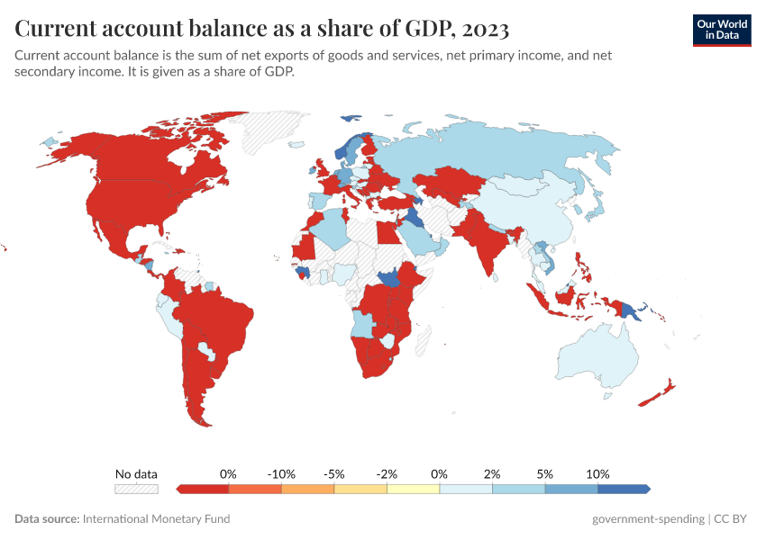 International Monetary Fund – processed by Our World in Data. “Current account balance as a share of GDP” [dataset]. International Monetary Fund, “International Monetary Fund, Balance of Payments Statistics Yearbook and data files, and World Bank and OECD GDP estimates.” [original data]. Retrieved May 8, 2025 from https://enhance-improve-who-empower.owid.pages.dev/grapher/current-account-balance-as-a-proportion-of-gdp