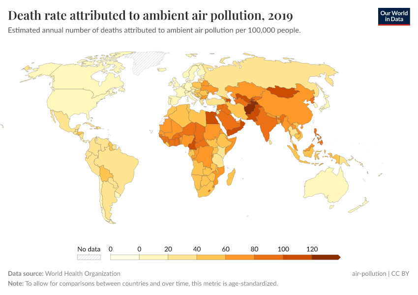 “Data Page: Death rate attributed to ambient air pollution”. Our World in Data (2025). Data adapted from World Health Organization. Retrieved from https://enhance-improve-who-empower.owid.pages.dev/grapher/death-rate-ambient-air-pollution [online resource]How to cite this data