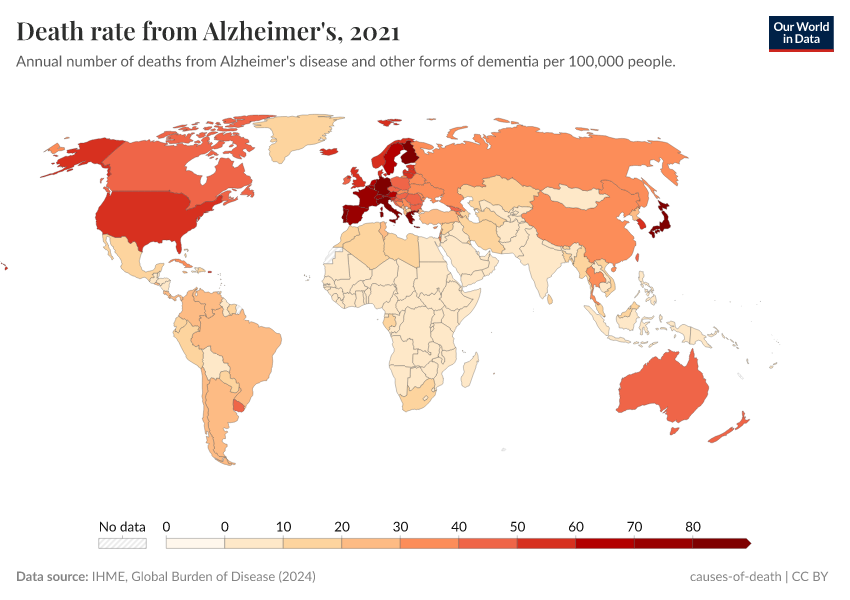 IHME, Global Burden of Disease (2024) – with minor processing by Our World in Data. “Death rate from Alzheimer's” [dataset]. IHME, Global Burden of Disease, “Global Burden of Disease - Deaths and DALYs” [original data]. Retrieved May 8, 2025 from https://enhance-improve-who-empower.owid.pages.dev/grapher/death-rate-from-alzheimers-other-dementias-gbd