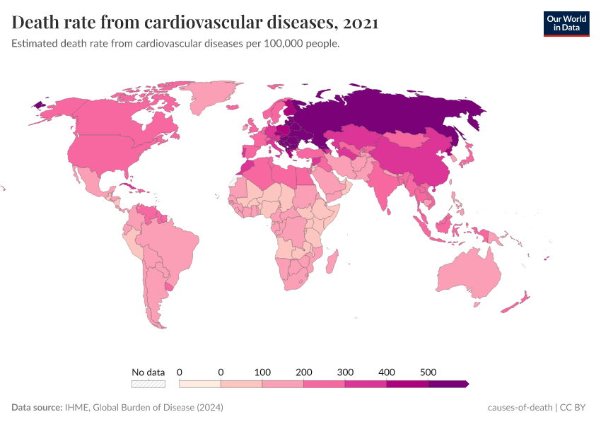 IHME, Global Burden of Disease (2024) – with minor processing by Our World in Data. “Death rate from cardiovascular diseases” [dataset]. IHME, Global Burden of Disease, “Global Burden of Disease - Deaths and DALYs” [original data]. Retrieved May 8, 2025 from https://enhance-improve-who-empower.owid.pages.dev/grapher/death-rate-from-cardiovascular-diseases