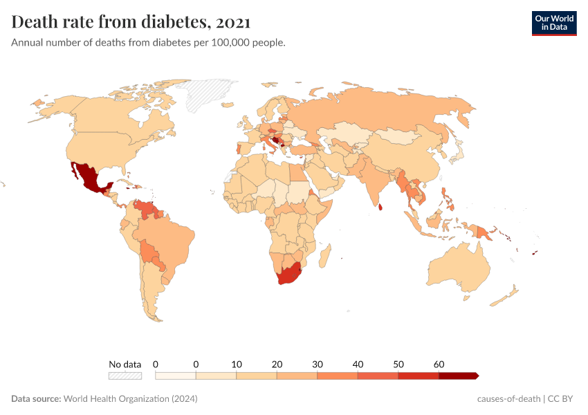 World Health Organization (2024) – with major processing by Our World in Data. “Death rate from diabetes” [dataset]. World Health Organization, “Global Health Estimates” [original data]. Retrieved May 8, 2025 from https://enhance-improve-who-empower.owid.pages.dev/grapher/death-rate-from-diabetes-ghe