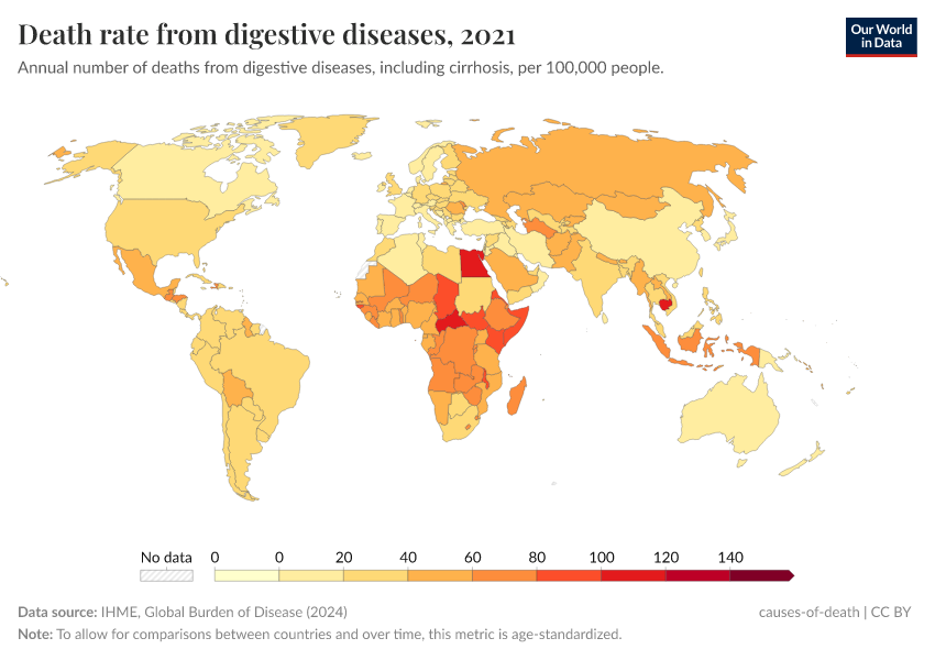 IHME, Global Burden of Disease (2024) – with minor processing by Our World in Data. “Death rate from digestive diseases” [dataset]. IHME, Global Burden of Disease, “Global Burden of Disease - Deaths and DALYs” [original data]. Retrieved May 8, 2025 from https://enhance-improve-who-empower.owid.pages.dev/grapher/death-rate-from-digestive-diseases