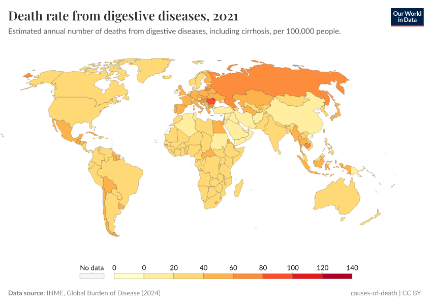 IHME, Global Burden of Disease (2024) – with minor processing by Our World in Data. “Death rate from digestive diseases” [dataset]. IHME, Global Burden of Disease, “Global Burden of Disease - Deaths and DALYs” [original data]. Retrieved May 8, 2025 from https://enhance-improve-who-empower.owid.pages.dev/grapher/death-rate-from-digestive-diseases-gbd