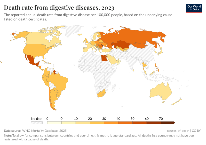 WHO Mortality Database (2024) – with minor processing by Our World in Data. “Death rate from digestive diseases” [dataset]. WHO Mortality Database, “WHO Mortality Database” [original data]. Retrieved May 8, 2025 from https://enhance-improve-who-empower.owid.pages.dev/grapher/death-rate-from-digestive-diseases-who-mdb