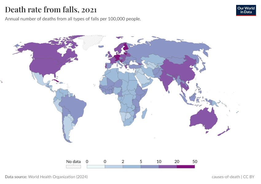 World Health Organization (2024) – with major processing by Our World in Data. “Death rate from falls” [dataset]. World Health Organization, “Global Health Estimates” [original data]. Retrieved May 8, 2025 from https://enhance-improve-who-empower.owid.pages.dev/grapher/death-rate-from-falls