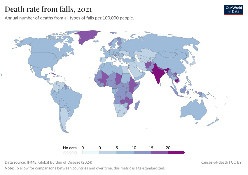 IHME, Global Burden of Disease (2024) – with minor processing by Our World in Data. “Death rate from falls” [dataset]. IHME, Global Burden of Disease, “Global Burden of Disease - Deaths and DALYs” [original data]. Retrieved May 8, 2025 from https://enhance-improve-who-empower.owid.pages.dev/grapher/death-rate-from-falls-gbd