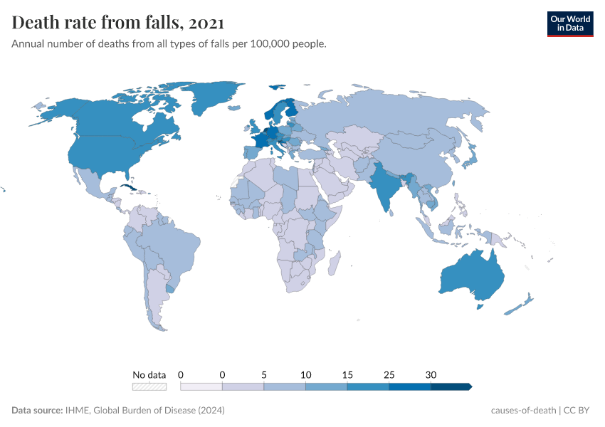 IHME, Global Burden of Disease (2024) – with minor processing by Our World in Data. “Death rate from falls” [dataset]. IHME, Global Burden of Disease, “Global Burden of Disease - Deaths and DALYs” [original data]. Retrieved May 8, 2025 from https://enhance-improve-who-empower.owid.pages.dev/grapher/death-rate-from-falls-gbd-rate
