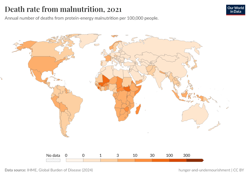 IHME, Global Burden of Disease (2024) – with minor processing by Our World in Data. “Death rate from malnutrition” [dataset]. IHME, Global Burden of Disease, “Global Burden of Disease - Deaths and DALYs” [original data]. Retrieved May 8, 2025 from https://enhance-improve-who-empower.owid.pages.dev/grapher/death-rate-from-malnutrition
