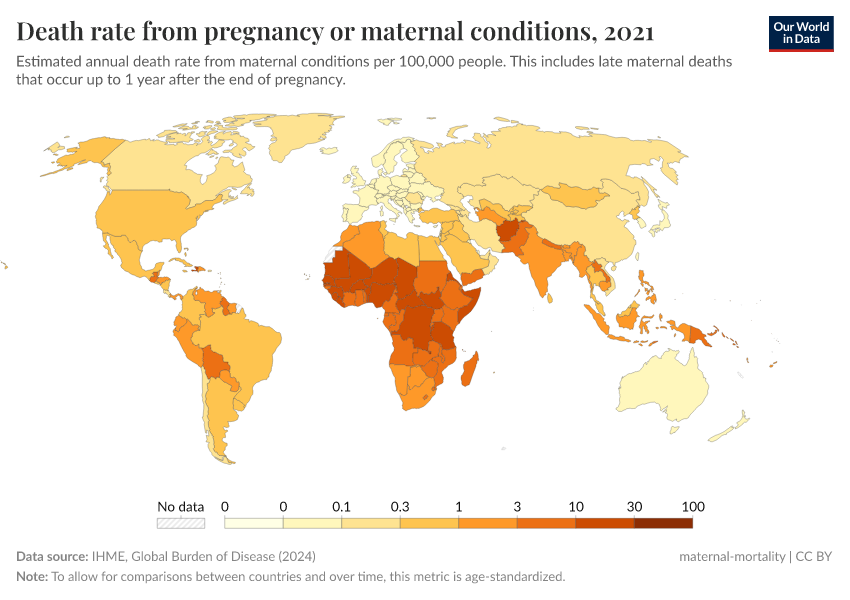 IHME, Global Burden of Disease (2024) – with minor processing by Our World in Data. “Death rate from pregnancy or maternal conditions” [dataset]. IHME, Global Burden of Disease, “Global Burden of Disease - Deaths and DALYs” [original data]. Retrieved May 8, 2025 from https://enhance-improve-who-empower.owid.pages.dev/grapher/death-rate-from-maternal-disorders-ihme