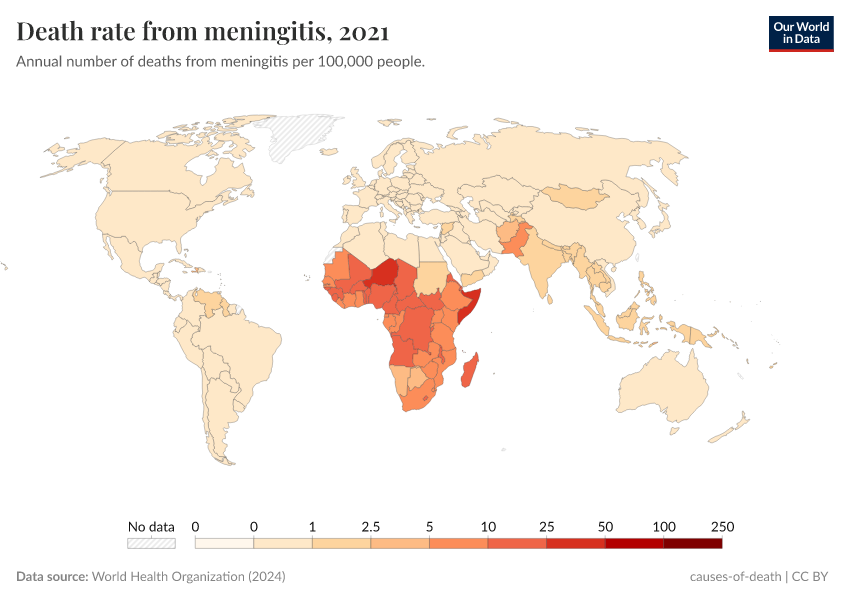 World Health Organization (2024) – with major processing by Our World in Data. “Death rate from meningitis” [dataset]. World Health Organization, “Global Health Estimates” [original data]. Retrieved May 8, 2025 from https://enhance-improve-who-empower.owid.pages.dev/grapher/death-rate-from-meningitis-who