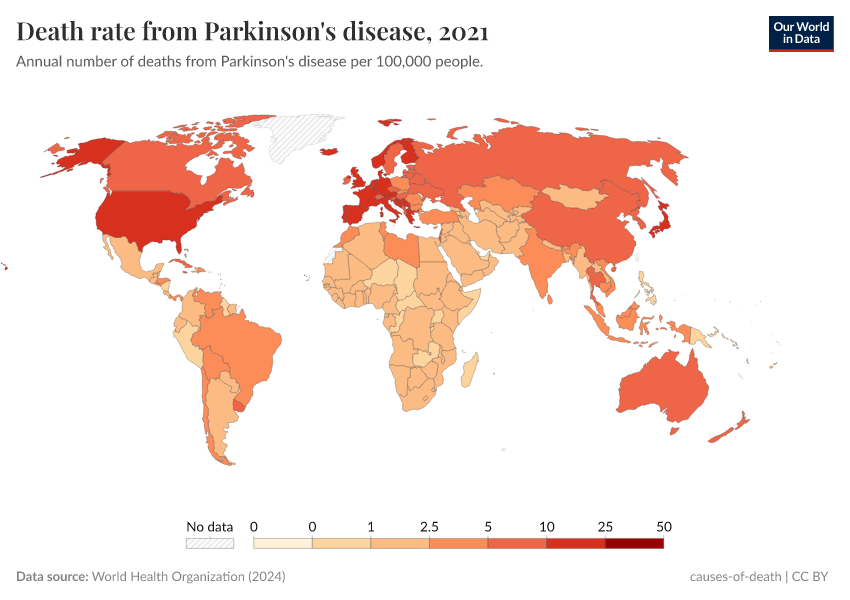 World Health Organization (2024) – with major processing by Our World in Data. “Death rate from Parkinson's disease” [dataset]. World Health Organization, “Global Health Estimates” [original data]. Retrieved May 8, 2025 from https://enhance-improve-who-empower.owid.pages.dev/grapher/death-rate-from-parkinsons-disease-ghe