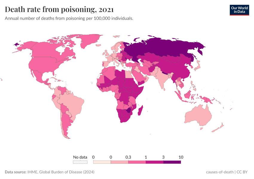 IHME, Global Burden of Disease (2024) – with minor processing by Our World in Data. “Death rate from poisoning” [dataset]. IHME, Global Burden of Disease, “Global Burden of Disease - Deaths and DALYs” [original data]. Retrieved May 8, 2025 from https://enhance-improve-who-empower.owid.pages.dev/grapher/death-rate-from-poisoning-gbd