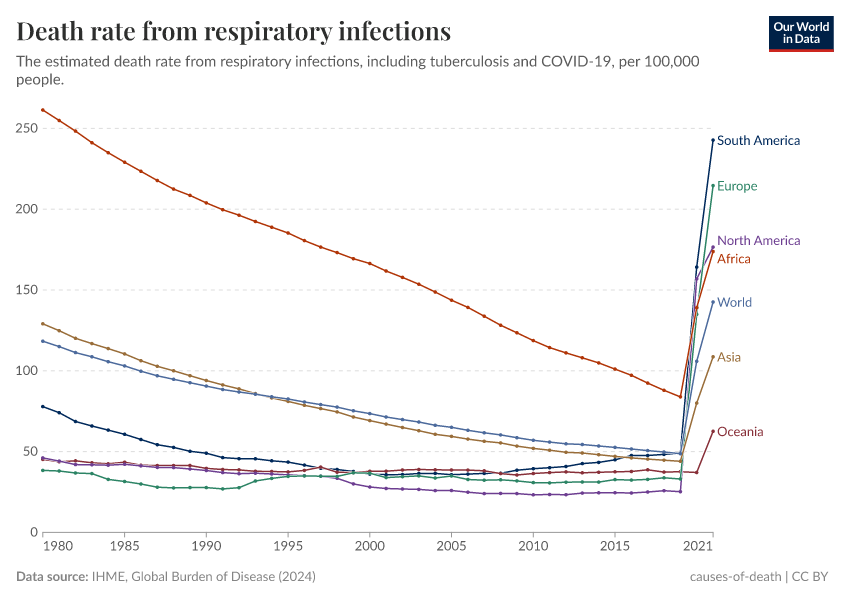 IHME, Global Burden of Disease (2024) – with minor processing by Our World in Data. “Death rate from respiratory infections” [dataset]. IHME, Global Burden of Disease, “Global Burden of Disease - Deaths and DALYs” [original data]. Retrieved May 8, 2025 from https://enhance-improve-who-empower.owid.pages.dev/grapher/death-rate-from-respiratory-infections-gbd