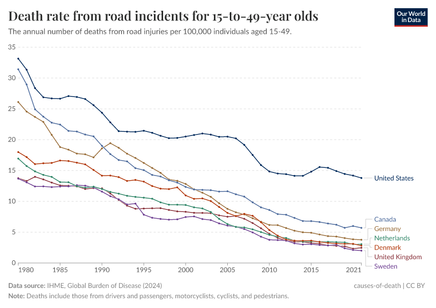 IHME, Global Burden of Disease (2024) – with minor processing by Our World in Data. “Death rate from road incidents for 15-to-49-year olds” [dataset]. IHME, Global Burden of Disease, “Global Burden of Disease - Deaths and DALYs” [original data]. Retrieved May 8, 2025 from https://enhance-improve-who-empower.owid.pages.dev/grapher/death-rate-from-road-accidents-for-15--to-49-year-olds