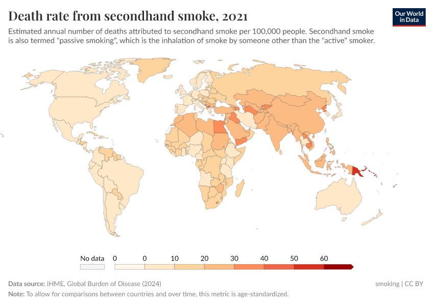 IHME, Global Burden of Disease (2024) – with minor processing by Our World in Data. “Death rate from secondhand smoke” [dataset]. IHME, Global Burden of Disease, “Global Burden of Disease - Risk Factors” [original data]. Retrieved May 8, 2025 from https://enhance-improve-who-empower.owid.pages.dev/grapher/death-rate-from-secondhand-smoke