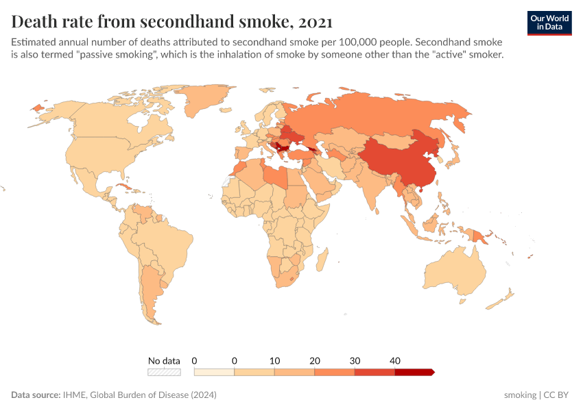IHME, Global Burden of Disease (2024) – with minor processing by Our World in Data. “Death rate from secondhand smoke” [dataset]. IHME, Global Burden of Disease, “Global Burden of Disease - Risk Factors” [original data]. Retrieved May 8, 2025 from https://enhance-improve-who-empower.owid.pages.dev/grapher/death-rate-from-secondhand-smoke-gbd