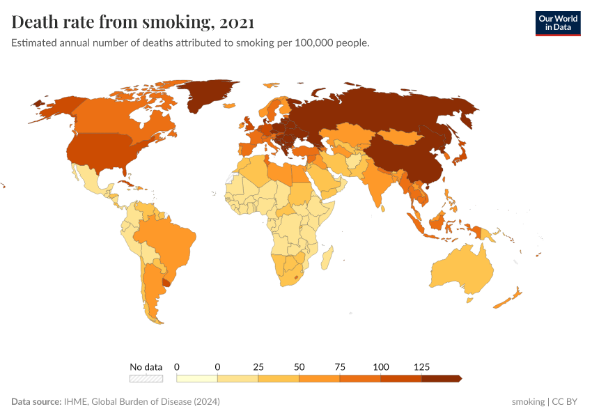 IHME, Global Burden of Disease (2024) – with minor processing by Our World in Data. “Death rate from smoking” [dataset]. IHME, Global Burden of Disease, “Global Burden of Disease - Risk Factors” [original data]. Retrieved May 8, 2025 from https://enhance-improve-who-empower.owid.pages.dev/grapher/death-rate-from-smoking