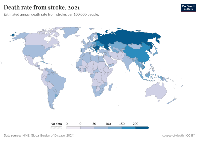 IHME, Global Burden of Disease (2024) – with minor processing by Our World in Data. “Death rate from stroke” [dataset]. IHME, Global Burden of Disease, “Global Burden of Disease - Deaths and DALYs” [original data]. Retrieved May 8, 2025 from https://enhance-improve-who-empower.owid.pages.dev/grapher/death-rate-from-strokes