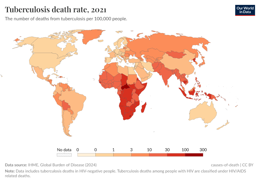 IHME, Global Burden of Disease (2024) – with minor processing by Our World in Data. “Tuberculosis death rate” [dataset]. IHME, Global Burden of Disease, “Global Burden of Disease - Deaths and DALYs” [original data]. Retrieved May 8, 2025 from https://enhance-improve-who-empower.owid.pages.dev/grapher/death-rate-from-tuberculosis-gbd