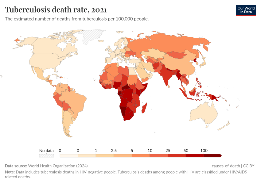 World Health Organization (2024) – with major processing by Our World in Data. “Tuberculosis death rate” [dataset]. World Health Organization, “Global Health Estimates” [original data]. Retrieved May 8, 2025 from https://enhance-improve-who-empower.owid.pages.dev/grapher/death-rate-from-tuberculosis-ghe