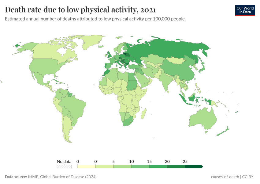 IHME, Global Burden of Disease (2024) – with minor processing by Our World in Data. “Death rate due to low physical activity” [dataset]. IHME, Global Burden of Disease, “Global Burden of Disease - Risk Factors” [original data]. Retrieved May 8, 2025 from https://enhance-improve-who-empower.owid.pages.dev/grapher/death-rates-due-to-low-physical-activity-gbd