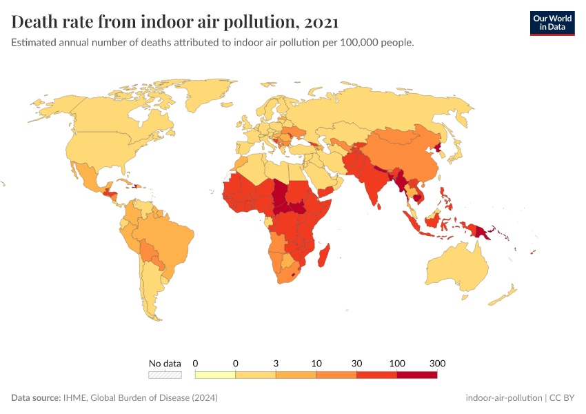 IHME, Global Burden of Disease (2024) – with minor processing by Our World in Data. “Death rate from indoor air pollution” [dataset]. IHME, Global Burden of Disease, “Global Burden of Disease - Risk Factors” [original data]. Retrieved May 8, 2025 from https://enhance-improve-who-empower.owid.pages.dev/grapher/death-rates-from-indoor-air-pollution-gbd
