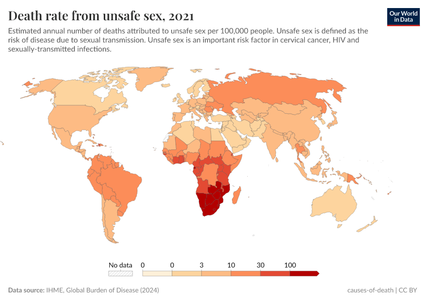 IHME, Global Burden of Disease (2024) – with minor processing by Our World in Data. “Death rate from unsafe sex” [dataset]. IHME, Global Burden of Disease, “Global Burden of Disease - Risk Factors” [original data]. Retrieved May 8, 2025 from https://enhance-improve-who-empower.owid.pages.dev/grapher/death-rates-from-unsafe-sex-gbd