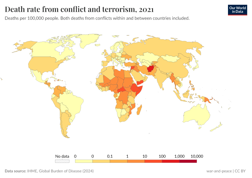 IHME, Global Burden of Disease (2024) – with minor processing by Our World in Data. “Death rate from conflict and terrorism” [dataset]. IHME, Global Burden of Disease, “Global Burden of Disease - Deaths and DALYs” [original data]. Retrieved May 8, 2025 from https://enhance-improve-who-empower.owid.pages.dev/grapher/deaths-conflict-terrorism-per-100000