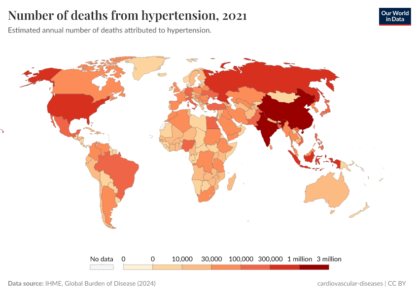 IHME, Global Burden of Disease (2024) – with minor processing by Our World in Data. “Number of deaths from hypertension” [dataset]. IHME, Global Burden of Disease, “Global Burden of Disease - Risk Factors” [original data]. Retrieved May 8, 2025 from https://enhance-improve-who-empower.owid.pages.dev/grapher/deaths-due-to-high-blood-pressure