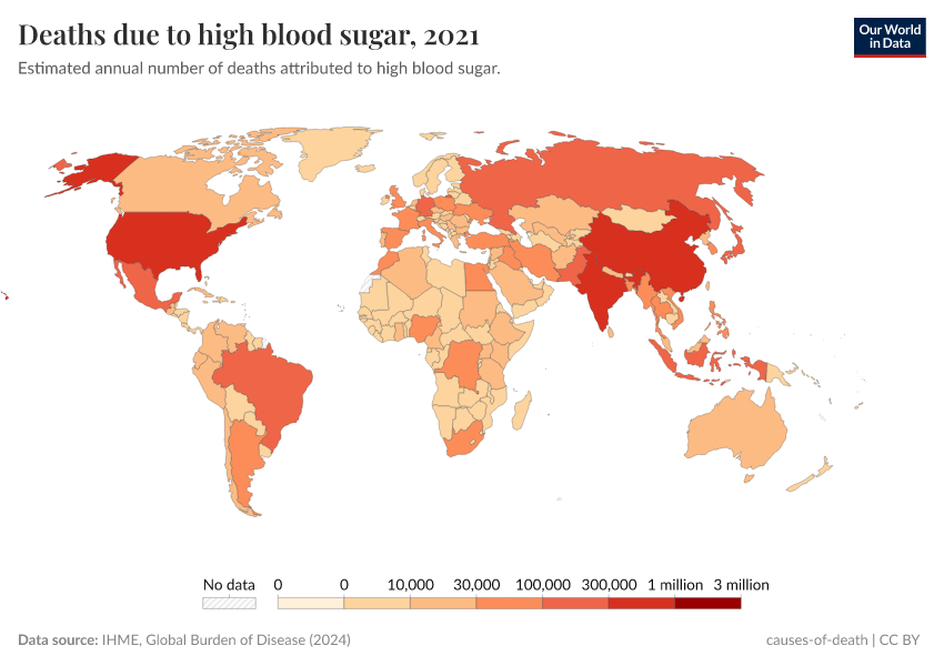 IHME, Global Burden of Disease (2024) – with minor processing by Our World in Data. “Deaths due to high blood sugar” [dataset]. IHME, Global Burden of Disease, “Global Burden of Disease - Risk Factors” [original data]. Retrieved May 8, 2025 from https://enhance-improve-who-empower.owid.pages.dev/grapher/deaths-due-to-high-blood-sugar
