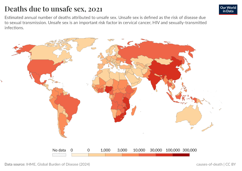 IHME, Global Burden of Disease (2024) – with minor processing by Our World in Data. “Deaths due to unsafe sex” [dataset]. IHME, Global Burden of Disease, “Global Burden of Disease - Risk Factors” [original data]. Retrieved May 8, 2025 from https://enhance-improve-who-empower.owid.pages.dev/grapher/deaths-due-to-unsafe-sex