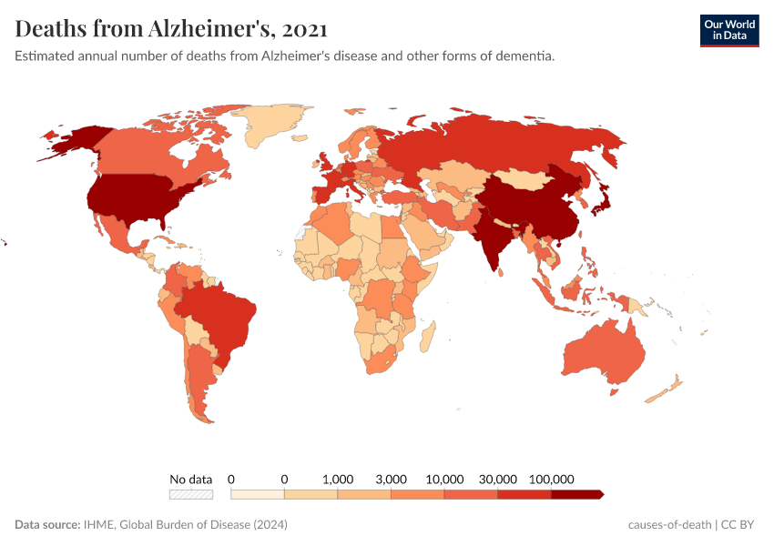 IHME, Global Burden of Disease (2024) – with minor processing by Our World in Data. “Deaths from Alzheimer's” [dataset]. IHME, Global Burden of Disease, “Global Burden of Disease - Deaths and DALYs” [original data]. Retrieved May 8, 2025 from https://enhance-improve-who-empower.owid.pages.dev/grapher/deaths-from-alzheimers