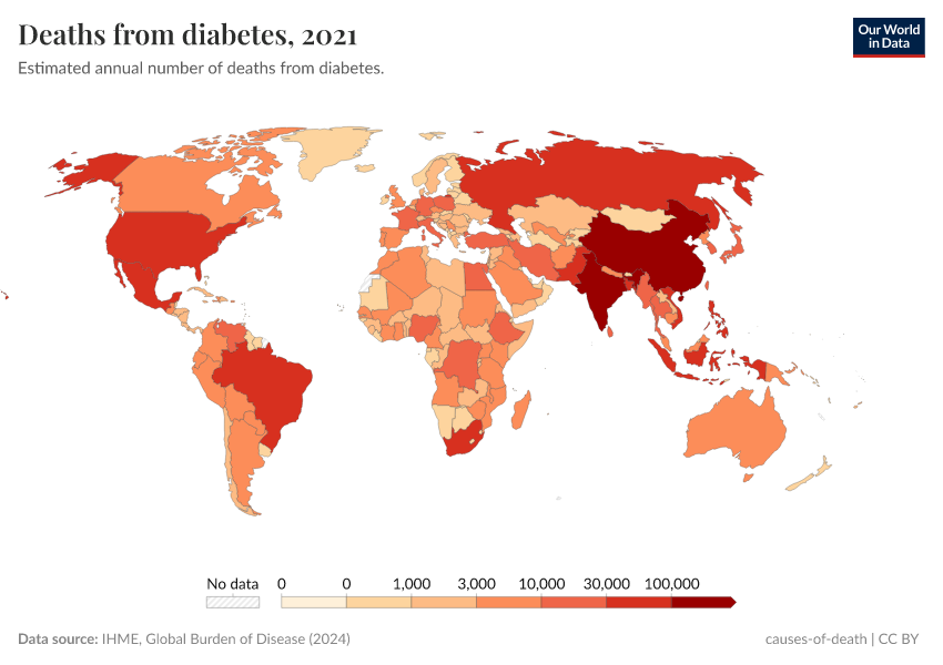 IHME, Global Burden of Disease (2024) – with minor processing by Our World in Data. “Deaths from diabetes” [dataset]. IHME, Global Burden of Disease, “Global Burden of Disease - Deaths and DALYs” [original data]. Retrieved May 8, 2025 from https://enhance-improve-who-empower.owid.pages.dev/grapher/deaths-from-diabetes