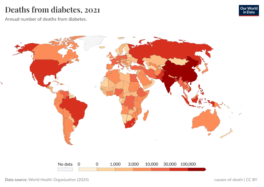 World Health Organization (2024) – with major processing by Our World in Data. “Deaths from diabetes” [dataset]. World Health Organization, “Global Health Estimates” [original data]. Retrieved May 8, 2025 from https://enhance-improve-who-empower.owid.pages.dev/grapher/deaths-from-diabetes-ghe