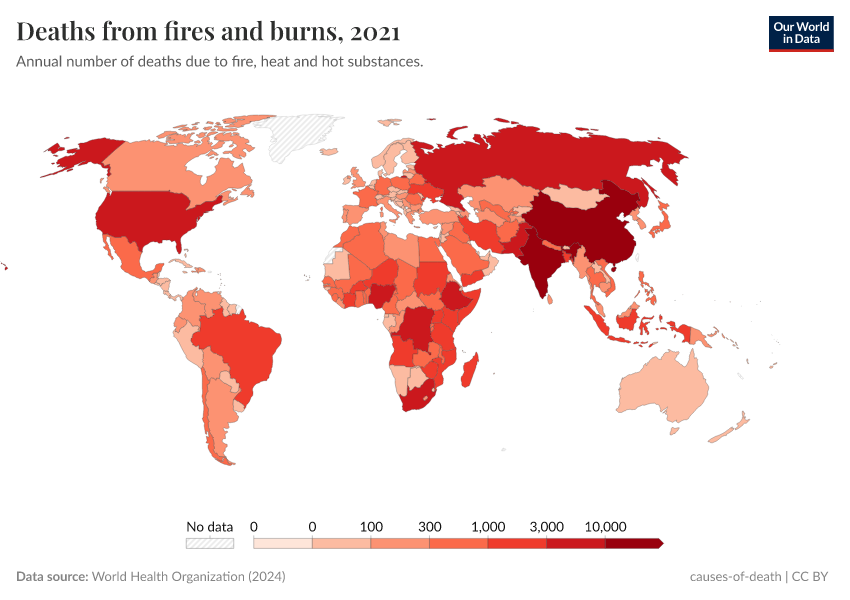 World Health Organization (2024) – with major processing by Our World in Data. “Deaths from fires and burns” [dataset]. World Health Organization, “Global Health Estimates” [original data]. Retrieved May 8, 2025 from https://enhance-improve-who-empower.owid.pages.dev/grapher/deaths-from-fires-and-burns-who