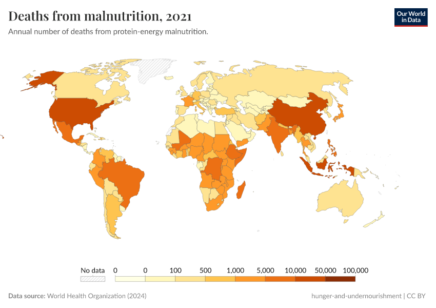 World Health Organization (2024) – with major processing by Our World in Data. “Deaths from malnutrition” [dataset]. World Health Organization, “Global Health Estimates” [original data]. Retrieved May 8, 2025 from https://enhance-improve-who-empower.owid.pages.dev/grapher/deaths-from-malnutrition-ghe