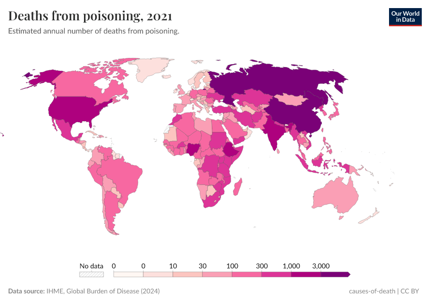 IHME, Global Burden of Disease (2024) – with minor processing by Our World in Data. “Deaths from poisoning” [dataset]. IHME, Global Burden of Disease, “Global Burden of Disease - Deaths and DALYs” [original data]. Retrieved May 8, 2025 from https://enhance-improve-who-empower.owid.pages.dev/grapher/deaths-from-poisoning