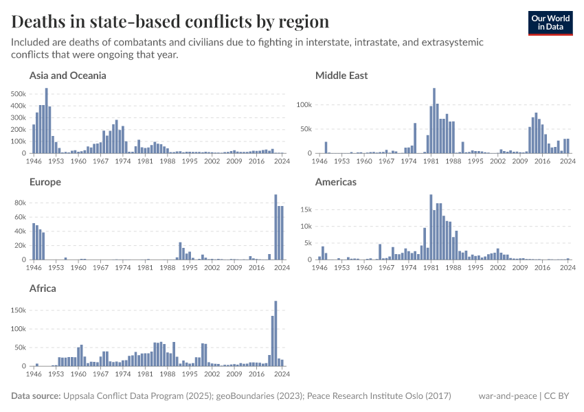 Uppsala Conflict Data Program (2024); Peace Research Institute Oslo (2017) – processed by Our World in Data. “Deaths in state-based conflicts by region” [dataset]. Uppsala Conflict Data Program, “Georeferenced Event Dataset v24.1”; Peace Research Institute Oslo, “Battle deaths v3.1” [original data]. Retrieved May 8, 2025 from https://enhance-improve-who-empower.owid.pages.dev/grapher/deaths-in-state-based-conflicts-by-region