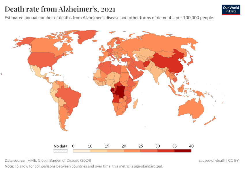 IHME, Global Burden of Disease (2024) – with minor processing by Our World in Data. “Death rate from Alzheimer's” [dataset]. IHME, Global Burden of Disease, “Global Burden of Disease - Deaths and DALYs” [original data]. Retrieved May 8, 2025 from https://enhance-improve-who-empower.owid.pages.dev/grapher/dementia-death-rates