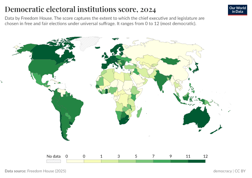 Freedom House (2024) – processed by Our World in Data. “Democratic electoral institutions” [dataset]. Freedom House, “Freedom in the World” [original data]. Retrieved May 8, 2025 from https://enhance-improve-who-empower.owid.pages.dev/grapher/democratic-electoral-institutions-fh