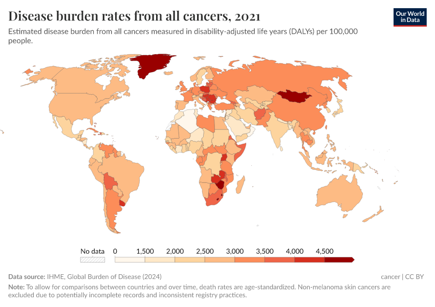 IHME, Global Burden of Disease (2024) – with minor processing by Our World in Data. “Disease burden rates from all cancers” [dataset]. IHME, Global Burden of Disease, “Global Burden of Disease - Deaths and DALYs” [original data]. Retrieved May 8, 2025 from https://enhance-improve-who-empower.owid.pages.dev/grapher/disease-burden-rates-from-cancers