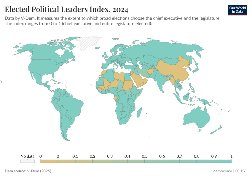 V-Dem (2025) – processed by Our World in Data. “Elected political leaders index” [dataset]. V-Dem, “Democracy report v15” [original data]. Retrieved May 8, 2025 from https://enhance-improve-who-empower.owid.pages.dev/grapher/elected-political-leaders-index