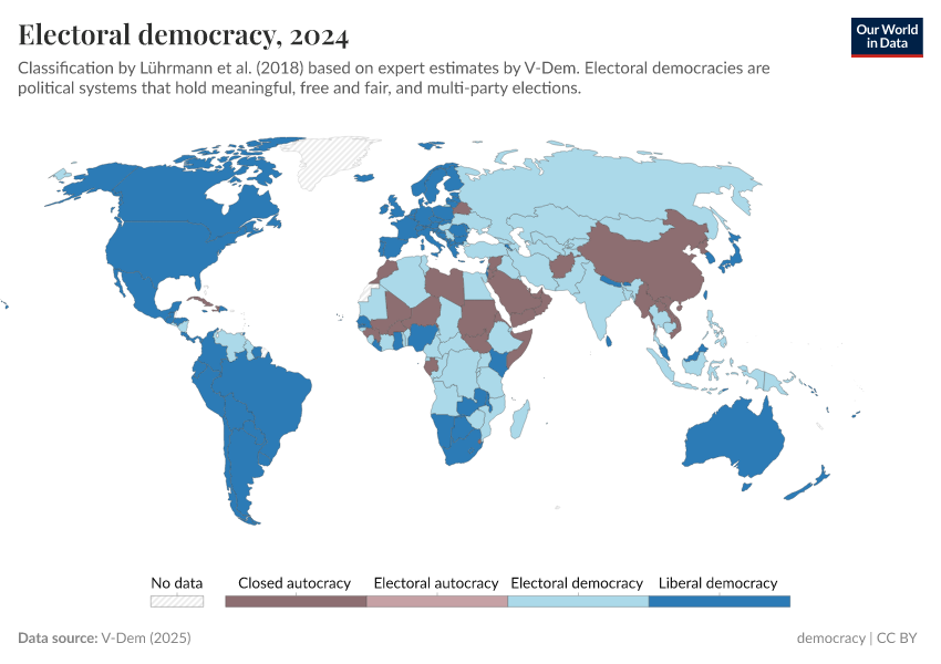 V-Dem (2025) – processed by Our World in Data. “Political regime – reduced” [dataset]. V-Dem, “Democracy report v15” [original data]. Retrieved May 8, 2025 from https://enhance-improve-who-empower.owid.pages.dev/grapher/electoral-democracy-row