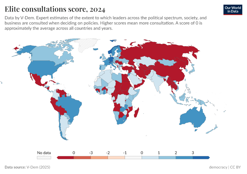 V-Dem (2025) – processed by Our World in Data. “Elite consultation – (best estimate)” [dataset]. V-Dem, “Democracy report v15” [original data]. Retrieved May 8, 2025 from https://enhance-improve-who-empower.owid.pages.dev/grapher/elite-consultations-score