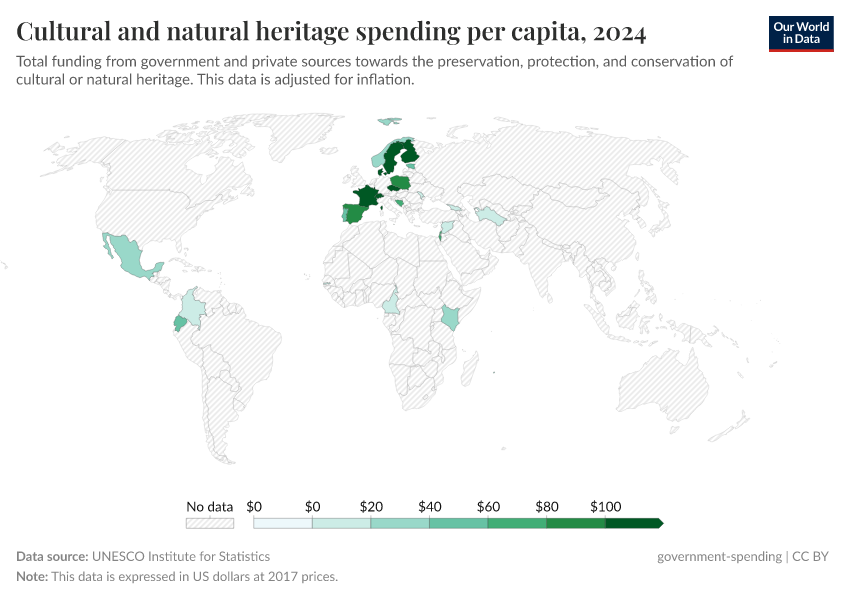 “Data Page: Cultural and natural heritage expenditure per capita”. Our World in Data (2025). Data adapted from UNESCO Institute for Statistics. Retrieved from https://enhance-improve-who-empower.owid.pages.dev/grapher/expenditure-on-cultural-and-natural-heritage-per-capita [online resource]How to cite this data