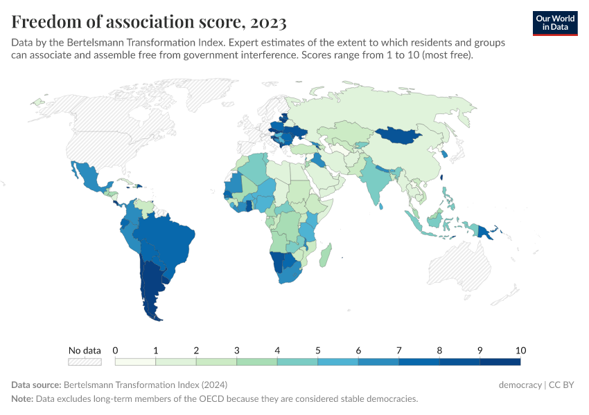 Bertelsmann Transformation Index (2024) – processed by Our World in Data. “Freedom of association score” [dataset]. Bertelsmann Transformation Index, “Bertelsmann Transformation Index, Scores” [original data]. Retrieved May 8, 2025 from https://enhance-improve-who-empower.owid.pages.dev/grapher/freedom-of-association-score-bti