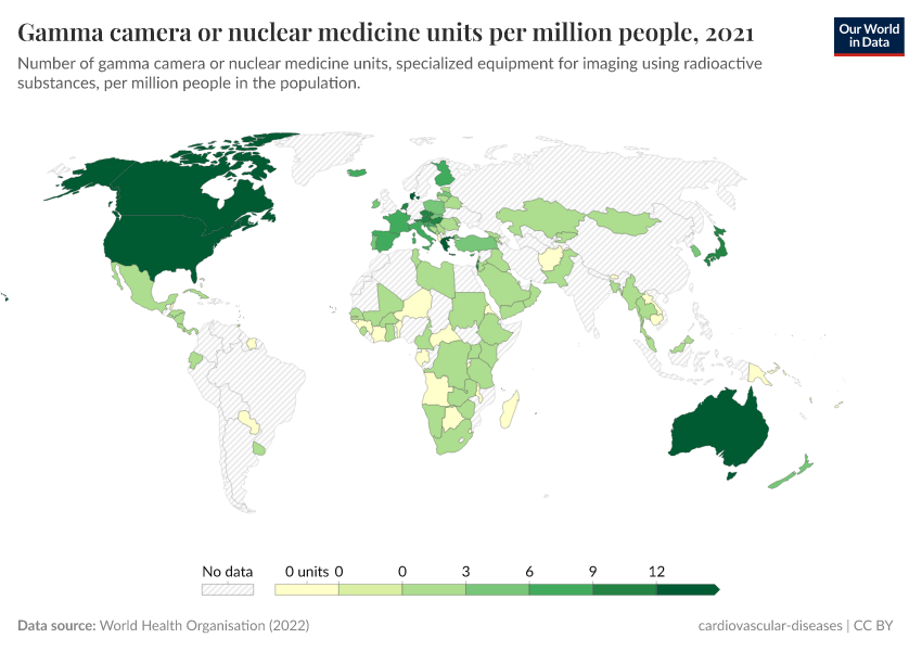 World Health Organisation (2022) – with minor processing by Our World in Data. “Gamma camera or nuclear medicine units per million people” [dataset]. World Health Organisation, “Global atlas of medical devices” [original data]. Retrieved May 8, 2025 from https://enhance-improve-who-empower.owid.pages.dev/grapher/gamma-camera-or-nuclear-medicine-availability